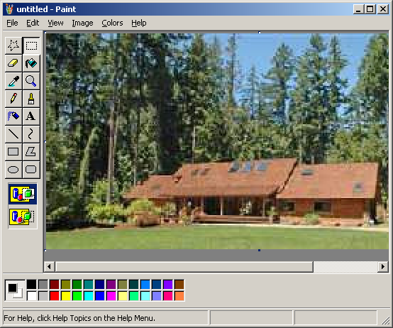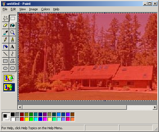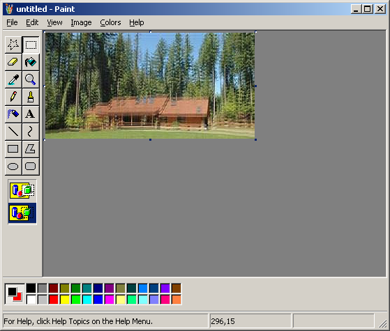 Now select the whole image (Ctrl+A) and copy and paste this into the other 200% size cabin picture. Set the background color to red and make sure you're in transparent mode. If you did it right, it should look the way it did originally.